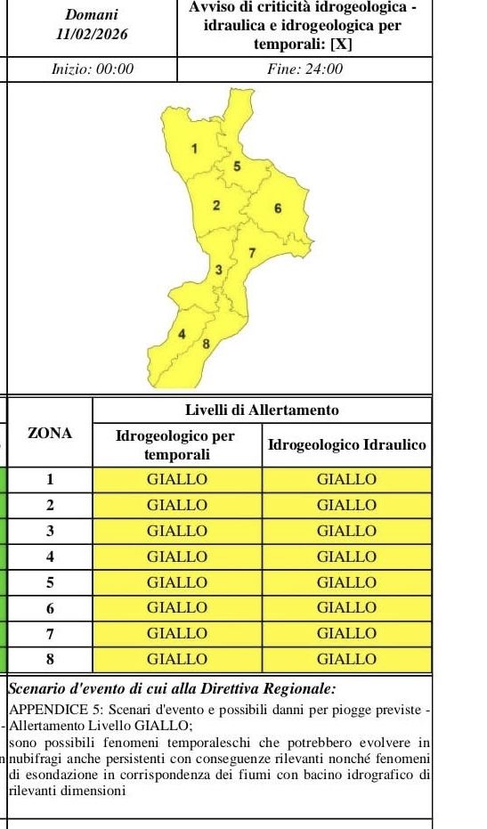 La Protezione Civile ha diramato Allerta Gialla su tutta la Calabria per la giornata di domani, martedì 11 febbraio 2026, a causa dell’arrivo di una nuova perturbazione di origine atlantica che interesserà l’intero territorio regionale.