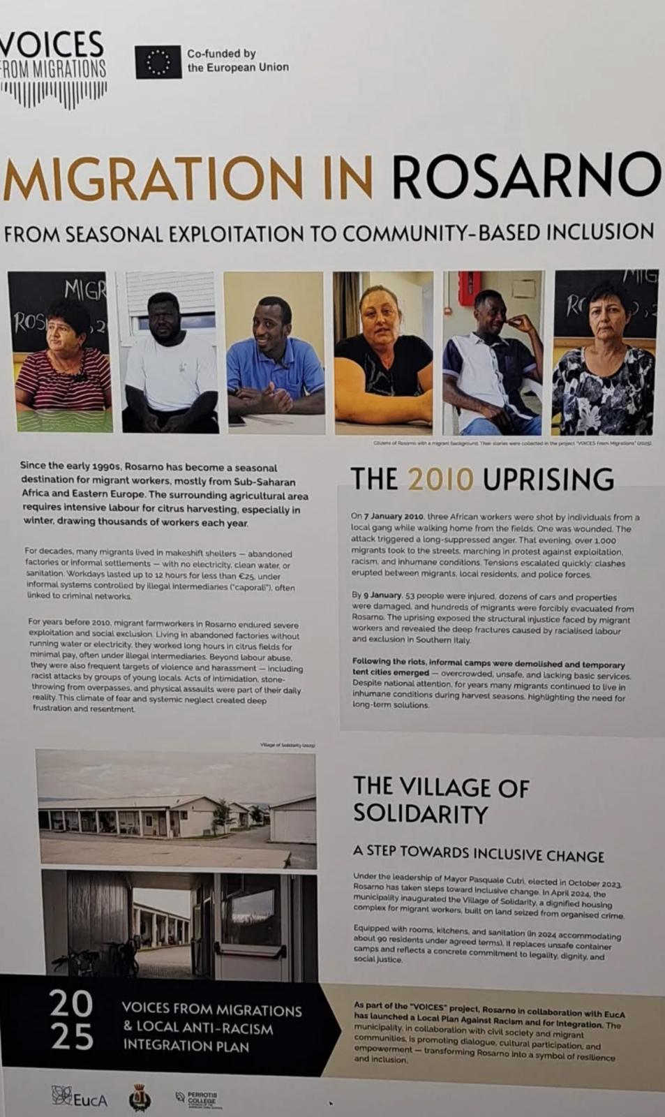 a mostra “Voices from Migrations”, ospitata nei giorni scorsi, ha proposto una rappresentazione dell’esperienza di Rosarno come modello di integrazione, portando questa narrazione all’attenzione delle istituzioni europee. Una rappresentazione che, tuttavia, entra in evidente contraddizione con le condizioni materiali in cui vivono oggi centinaia di lavoratori migranti nella Piana di Gioia Tauro.