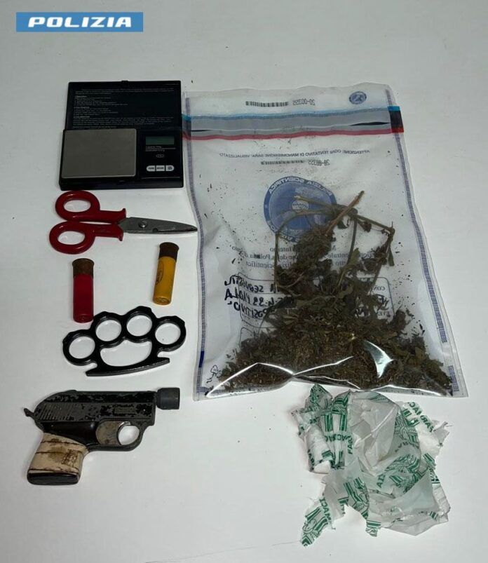 Nel corso dell’attività di polizia giudiziaria, l’uomo è stato trovato in possesso di un’arma clandestina, di due cartucce da fucile da caccia calibro 20 e di circa 30 grammi di marijuana, parte dei quali già suddivisi in dosi.