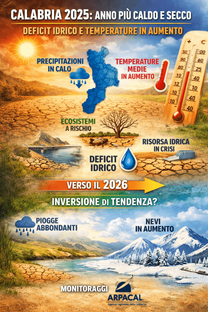 “Il 2025 si conferma in Calabria come un anno caratterizzato da criticità climatiche rilevanti, con un quadro complessivo segnato da riduzione delle precipitazioni e aumento delle temperature medie.