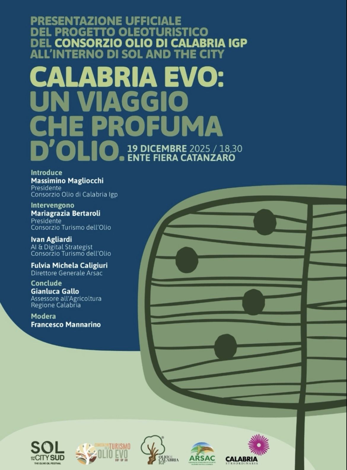 Il prossimo 19 dicembre 2025, alle 18.30, presso l’Ente Fiera di Catanzaro, si terrà la presentazione ufficiale del progetto oleoturistico del Consorzio Olio di Calabria IGP, inserito nel programma Sol and the City. L’iniziativa, dal titolo evocativo “Calabria EVO: un viaggio che profuma d’olio”, rappresenta un passo decisivo nella strategia di valorizzazione dell’olio extravergine di oliva calabrese come esperienza culturale, turistica e identitaria, rafforzando il legame tra territorio, tradizione e innovazione.