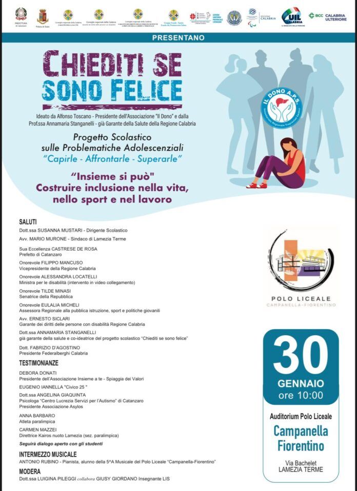 Lamezia Terme – Un momento di riflessione profonda dedicato alle nuove generazioni, alle loro fragilità e al valore dell’inclusione. Venerdì 30 gennaio, alle ore 10:00, l’Auditorium del Polo Liceale “Campanella-Fiorentino” ospiterà un nuovo appuntamento del progetto scolastico “Chiediti se sono felice”.