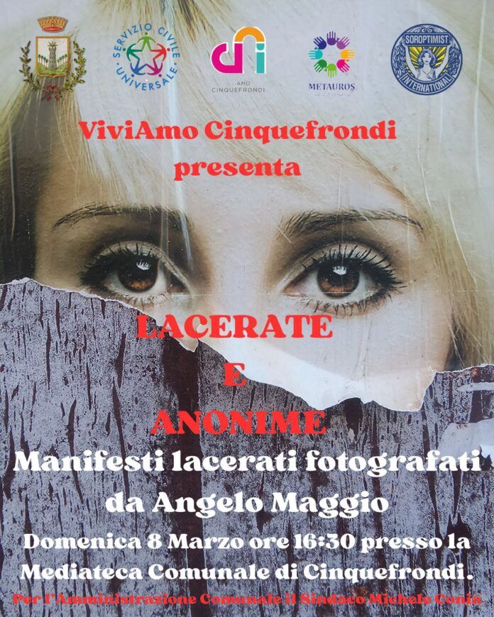 L’Amministrazione Comunale di Cinquefrondi è lieta di annunciare che domenica 8 marzo alle ore 16:30, presso la Mediateca Comunale “Pasquale Creazzo”, si inaugurerà la mostra fotografica “Lacerate ed Anonime” del fotografo Angelo Maggio.