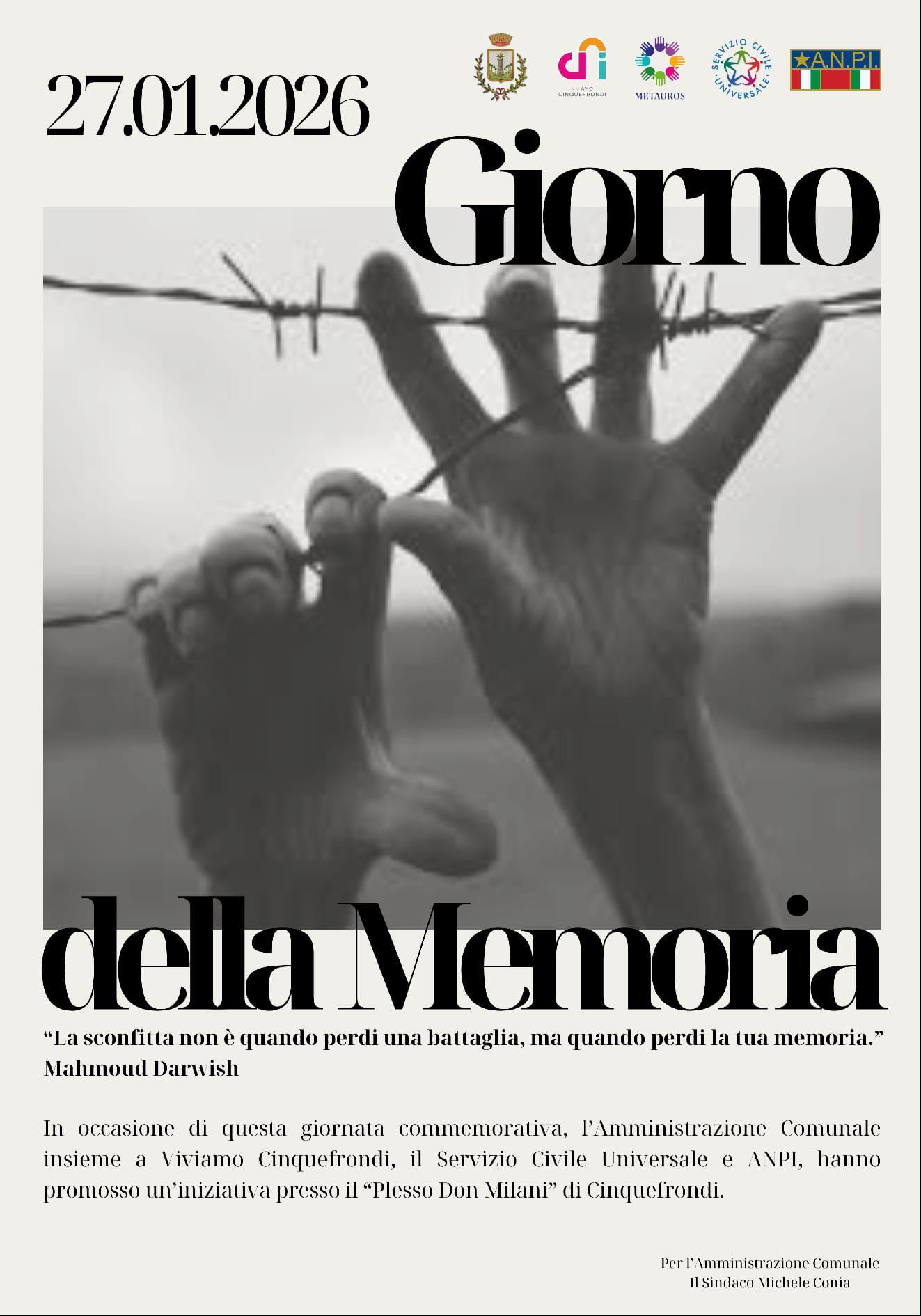 “Il Comune di Cinquefrondi, da sempre profondamente sensibile ai temi della memoria storica, della difesa dei diritti umani e dei valori democratici, rinnova anche quest’anno il proprio impegno in occasione della Giornata della Memoria, ricorrenza fondamentale per ricordare le vittime della Shoah e di tutte le persecuzioni fondate sull’odio, sull’intolleranza e sulla negazione della dignità umana.