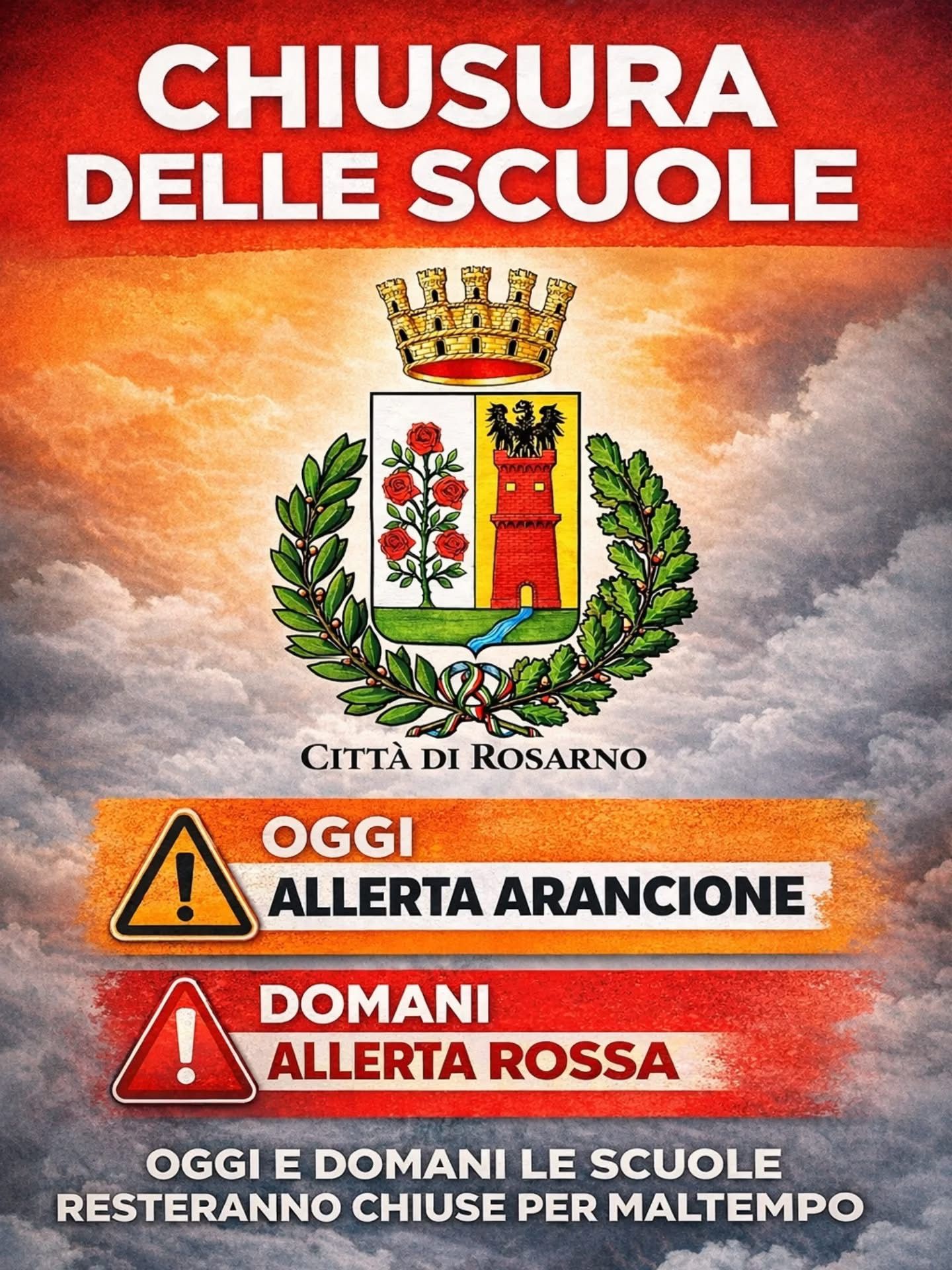 Il Comune di Rosarno ha disposto la chiusura delle scuole di ogni ordine e grado per la giornata di martedì 20 gennaio 2026, a causa delle avverse condizioni meteorologiche previste sul territorio comunale.