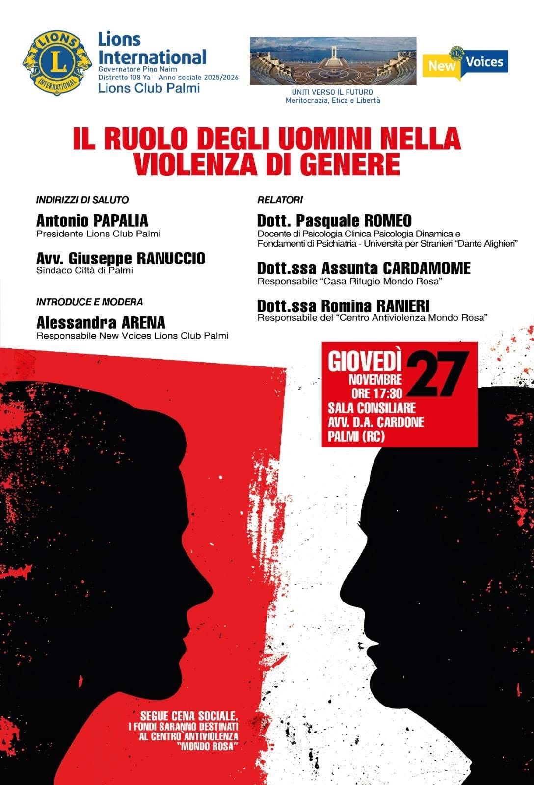 Il 27 novembre 2025, dalle 17:00 alle 19:00, presso la Sala Consiliare “Avv. D.A. Cardone” del Comune di Palmi, il Lions Club Palmi promuoverà l’incontro dal titolo “Il ruolo degli uomini nella violenza di genere”, inserito nel programma internazionale New Voices, volto a sostenere la parità, l’inclusione e il contrasto alla violenza di genere.