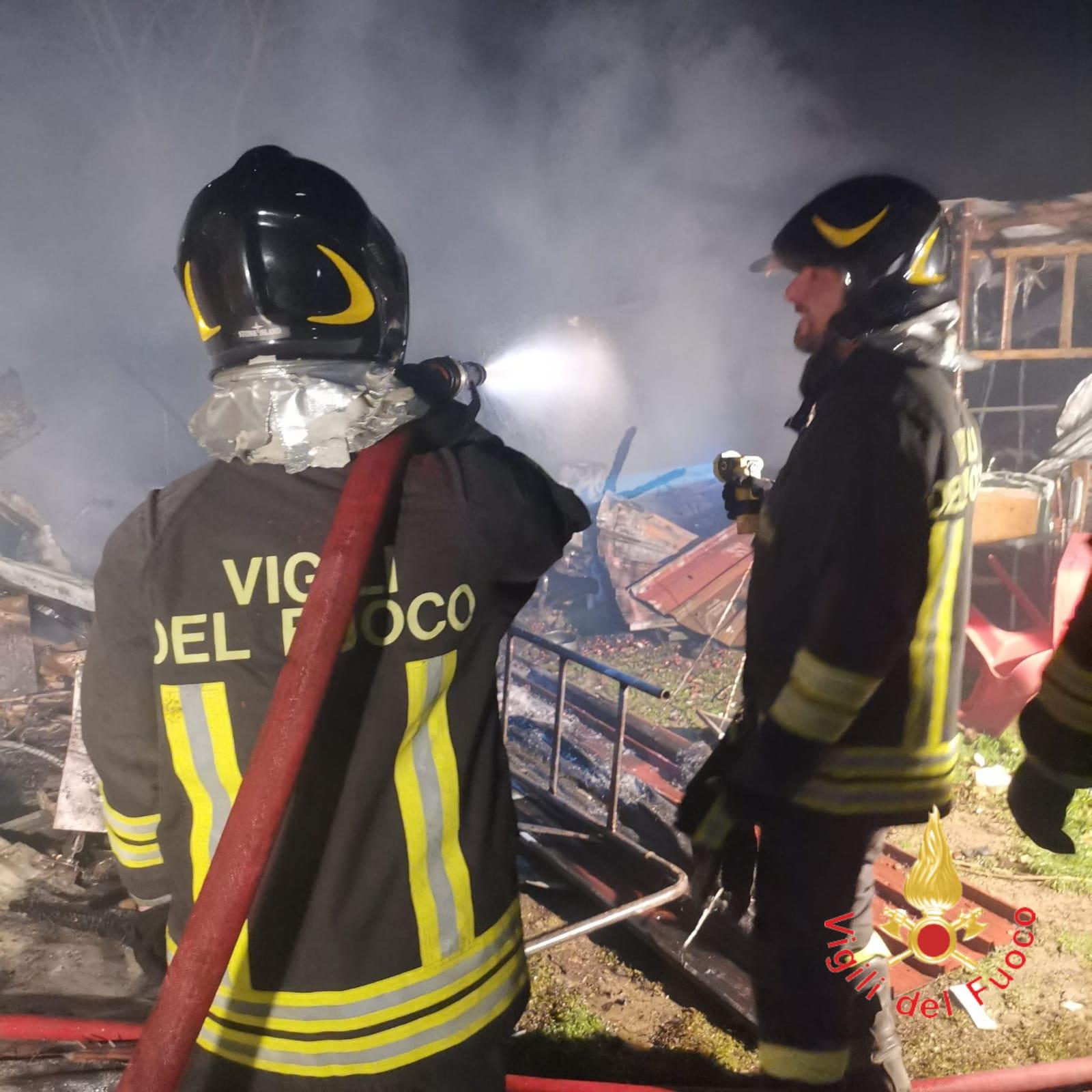 L’intervento tempestivo dei Vigili del Fuoco ha consentito la completa estinzione delle fiamme, evitando che l’incendio si propagasse alle case limitrofe. I soccorritori hanno inoltre provveduto alla messa in sicurezza di alcune bombole di GPL presenti all’interno dei magazzini e dell’intera area interessata dall’evento.