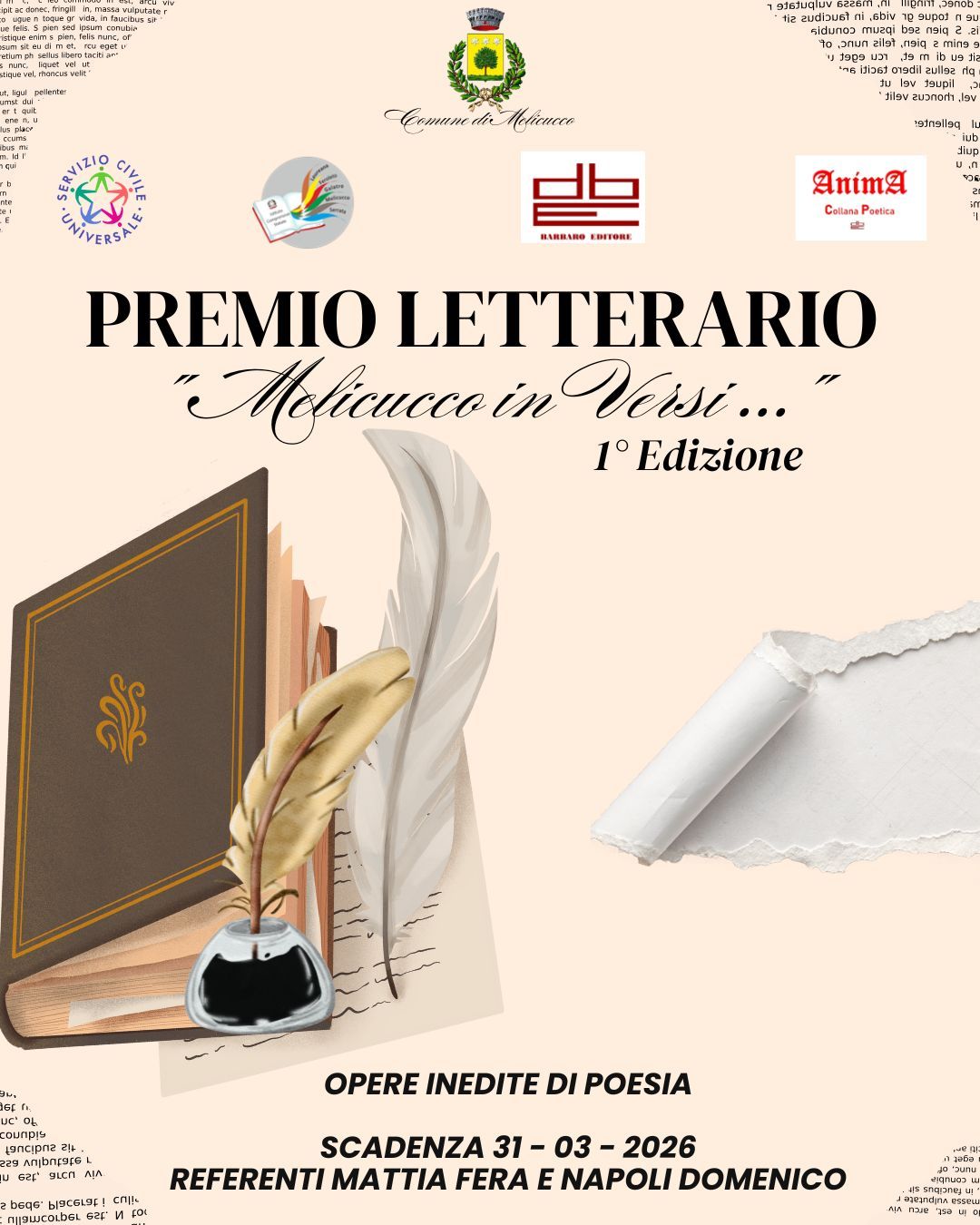 L’Amministrazione comunale e i Volontari del Servizio Civile, con la collaborazione del poeta 𝗗𝗼𝗺𝗲𝗻𝗶𝗰𝗼 𝗡𝗮𝗽𝗼𝗹𝗶, hanno promosso il concorso letterario denominato “𝗠𝗲𝗹𝗶𝗰𝘂𝗰𝗰𝗼 𝗶𝗻𝘃𝗲𝗿𝘀𝗶…”, aperto alla partecipazione di 𝗮𝘂𝘁𝗼𝗿𝗶 𝗱𝗶 𝗼𝗴𝗻𝗶 𝗻𝗮𝘇𝗶𝗼𝗻𝗮𝗹𝗶𝘁à e agli 𝘀𝘁𝘂𝗱𝗲𝗻𝘁𝗶 𝗱𝗶 𝗼𝗴𝗻𝗶 𝗼𝗿𝗱𝗶𝗻𝗲 𝗲 𝗴𝗿𝗮𝗱𝗼 frequentanti gli istituti scolastici del Comune di Melicucco.