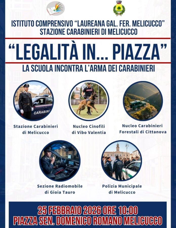La Stazione Carabinieri di Melicucco e l’Istituto Comprensivo “Laureana Gal. Fer. Melicucco” sono lieti di annunciare l’evento “Legalità in… Piazza”, una mattinata dedicata al confronto tra le Istituzioni e i giovani cittadini.