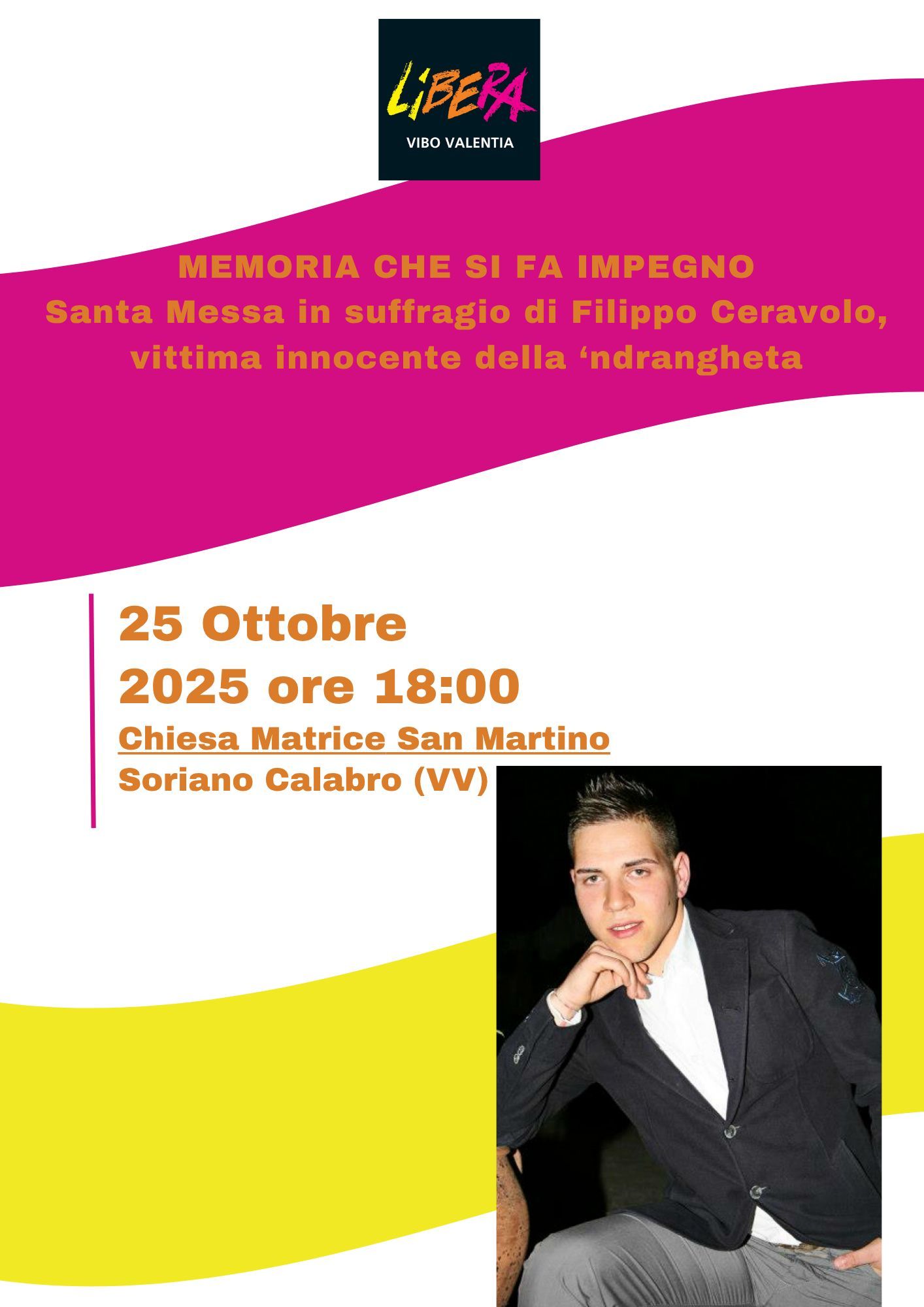A tredici anni dalla sua scomparsa, Filippo Ceravolo viene ricordato da Libera Vibo Valentia, insieme alla famiglia Ceravolo e all’intera comunità di Soriano Calabro. La vita del giovane, spezzata a soli diciannove anni dalla violenza della ‘ndrangheta, rimane simbolo di innocenza, sogni e speranza.
