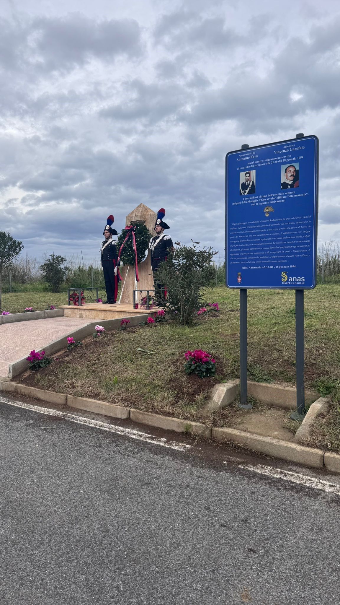 La cerimonia è iniziata a Palmi, presso la Chiesa di San Rocco, con la messa in suffragio, officiata da S.E.R. Mons. Giuseppe AlbertiVescovo della Diocesi Oppido Mamertina – Palmi, e proseguita con la deposizione di una corona d’alloro presso l’area di sosta dell’autostrada, prima dell’uscita di Scilla, luogo dell’attentato e sede del monumento commemorativo dedicato ai due Carabinieri.