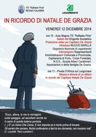 Venerdì 12 Dicembre 2014 alle ore 10.00 presso l’Aula Magna dell’Istituto “Raffaele Piria” e alle ore 11.00 presso la Pineta D’Africa sul Lungomare di Reggio Calabria, si terrà, promosso da Legambiente e dall’Istituto “Raffaele Piria” un’iniziativa in ricordo di Natale De Grazia, un “eroe” reggino nella lotta alle “ecomafie”. Il Capitano di Fregata della Capitaneria di Porto di Reggio Calabria, punta di diamante e motore del pool degli investigatori che conduceva l’inchiesta sulle navi dei veleni, morto nella notte tra il 12 e 13 dicembre mentre si recava a La Spezia nell’ambito di delicate e rischiose indagini, rappresenta una delle figure più luminose e prestigiose della storia recente della città dello stretto.