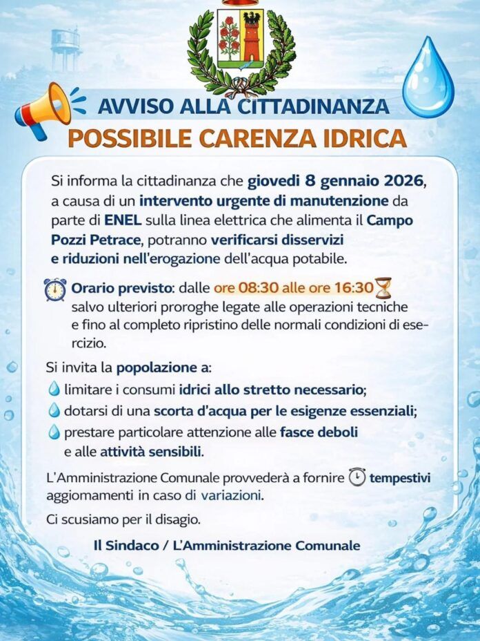 L’Amministrazione comunale di Rosarno informa la cittadinanza che giovedì 8 gennaio 2026 potrebbero verificarsi disservizi e riduzioni nell’erogazione dell’acqua potabile a causa di un intervento urgente di manutenzione da parte di Enel sulla linea elettrica che alimenta il Campo pozzi Petrace.