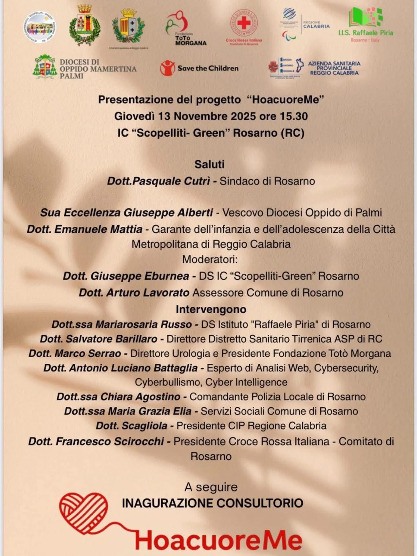 Il progetto “HoacuoreMe” e il nuovo Consultorio rappresentano un momento importante di collaborazione tra istituzioni, scuola, sanità, diocesi e mondo associativo, con l’obiettivo di costruire una Rosarno che metta al centro la persona, la famiglia e la comunità.