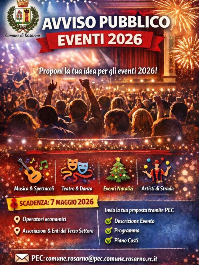 Il Comune di Rosarno avvia la programmazione culturale per l’anno 2026 con la pubblicazione di un avviso esplorativo finalizzato alla raccolta di proposte di eventi e attività di intrattenimento.