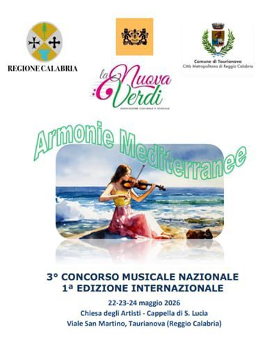 È tutto pronto per la terza edizione del Concorso Internazionale “Armonie Mediterranee”, organizzato dall’Associazione di promozione sociale “La Nuova Verdi”. L’evento si svolgerà dal 22 al 24 maggio 2026 presso la Chiesa degli Artisti di Taurianova, luogo ormai divenuto un autentico punto di riferimento per numerosi musicisti e interpreti, capace di accogliere e valorizzare appuntamenti culturali e concerti di rilievo.